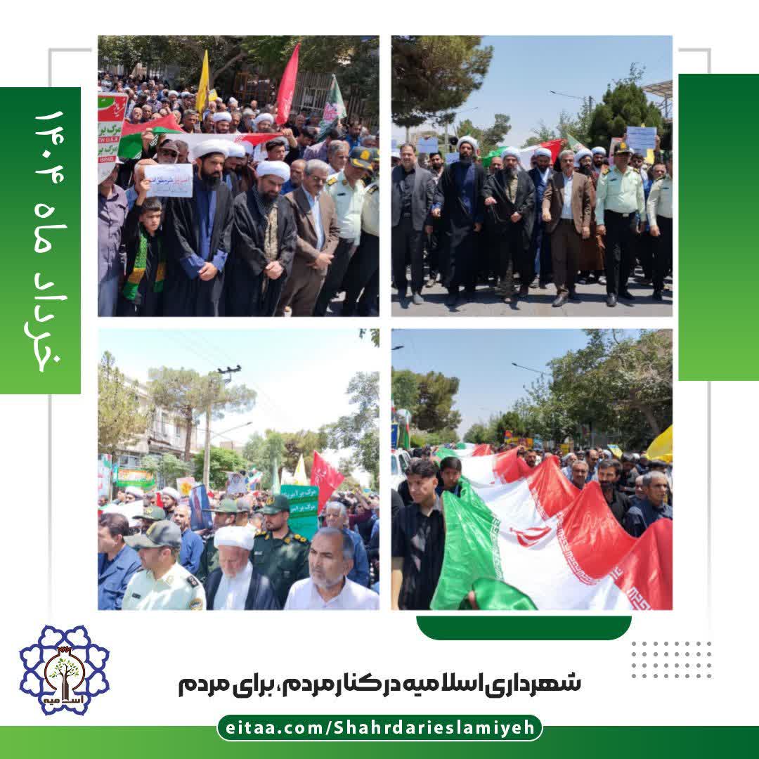 حضور گسترده و پرشور مردم متدین و انقلابی شهر اسلامیه در مراسم سیاسی و عبادی نماز جمعه و مراسم راهپیمایی و محکومیت جنایات رژیم صهیونیستی در تجاوز به خاک جمهوری اسلامی ایران و شهادت جمعی از سرداران و فرماندهان سپاه ، دانشمندان هسته ای و مردم بی گناه